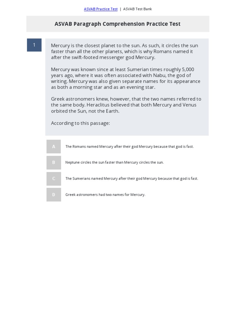 ASVAB Paragraph Comprehension Practice Test 2 PDF Mercury - The armed services vocational aptitude battery (asvab) is a standardized test on science, math, and language that helps identify which careers may be a fit for you when you join. This test contains 10 asvab paragraph comprehension practice questions with explanations, to be completed in 20 minutes. Asvab paragraph comprehension practice test 1. Members save 30%over 760k audio titlesexclusive seriesacclaimed. You should also read this: H-t-p Test