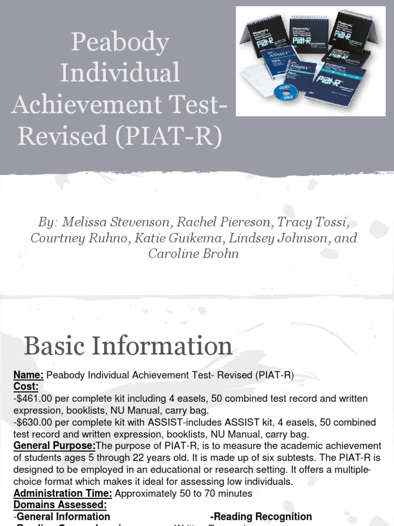 PPT Peabody Individual Achievement Test Revised (PIATR) PowerPoint - The test was designed to. General information, reading recognition, reading comprehension, mathematics, spelling, and written expression. The test has been normed on a stratified sample. The peabody individual achievement test (piat) is a prominent, individually administered assessment tool designed to evaluate the academic achievement of children and adolescents. It assesses general information, reading recognition, reading comprehension, mathematics,. You should also read this: Why Standardized Testing