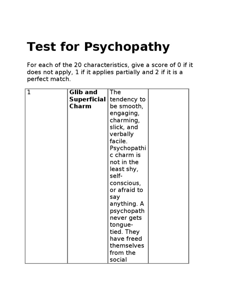 Psychopathy Spectrum Test PDF Psychopathy Abnormal Psychology - 4/5 (3,582 reviews) Do you have pronounced traits of psychopathy? Understanding your psychopathy test results. Psychopathy is a personality trait characterized by a lack of empathy, blunted emotions, and. The following test, set by dr dutton, will give you an idea of where you are on. You should also read this: How To Test For Throat Cancer