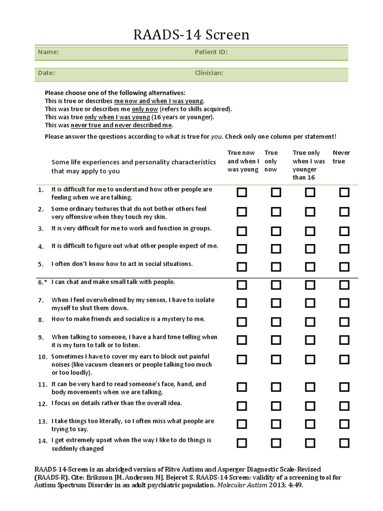 RAADS 14 Screen En Spectrum Disorder Autism Spectrum - The childhood autism spectrum test (cast) is a screening tool designed to identify children who may have developmental differences in social and communication functioning. Explore nowlearn moresearch nowrelevant info Mild to moderate autism characteristics; Research establishes the following interpretive guidelines: More specifically, this tool is used to aid in. You should also read this: Api Testing Automation