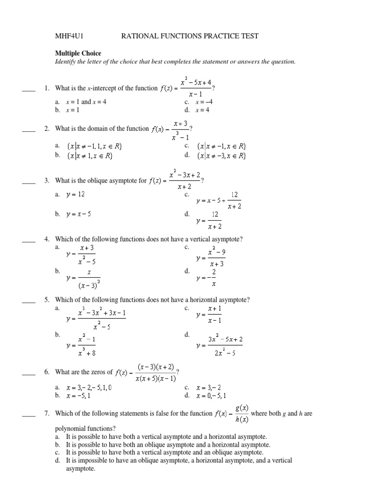 Functions UNIT TEST [Part 1] by Teach Simple - Determine the lowest common denominator. (unit 1) polynomials and rational functions name: Find other quizzes for mathematics and more on quizizz for free! Determine, to the nearest hundredth, the instantaneous rate of change of f (x ) at x = 5. Mhf4u rational functions practice test 1. You should also read this: Atb Test Practice