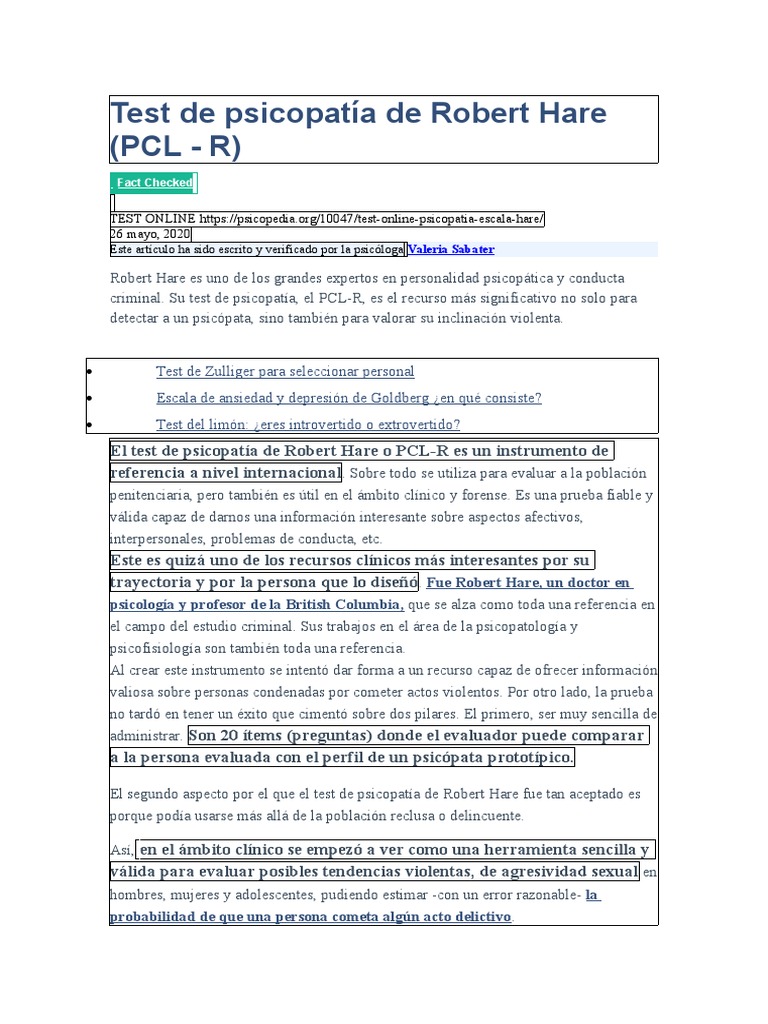 Test de Psicopatía de Robert Hare PDF Psicopatía Validez - However, many professionals requested a. A psychometric assessment of hare’s checklist for psychopathy on an english prison population. The standard screening test for potential psychopaths is the hare psychopathy checklist. Take our hare psychopathy checklist test and learn how to avoid psychopathy. Salekin, r., rogers, r., & sewell, k., (1996). You should also read this: Servsafe Test 90 Questions And Answers Quizlet
