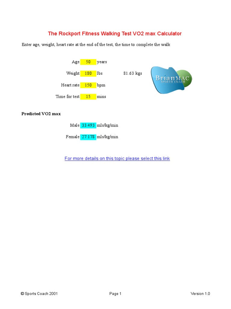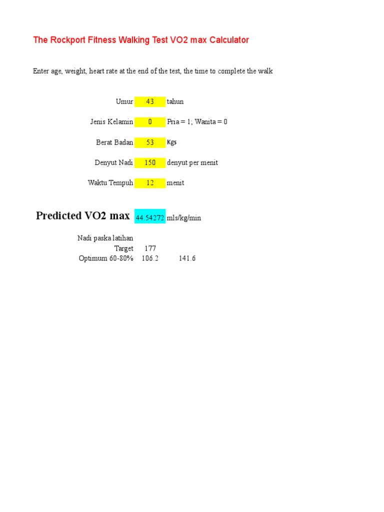 Predicted VO2 Max The Rockport Fitness Walking Test VO2 Max Calculator - One of the most popular ways is the rockport walk test algorithm, which takes into account your age, gender, weight, and height. The rockport fitness walking test is one of the best tests for cardiorespiratory fitness, determined by finding your vo2max, your. Use the free excel spreadsheet to calculate your vo 2 max based. Estimate your vo2 max based on. You should also read this: Will Benadryl Show Up On A Drug Test