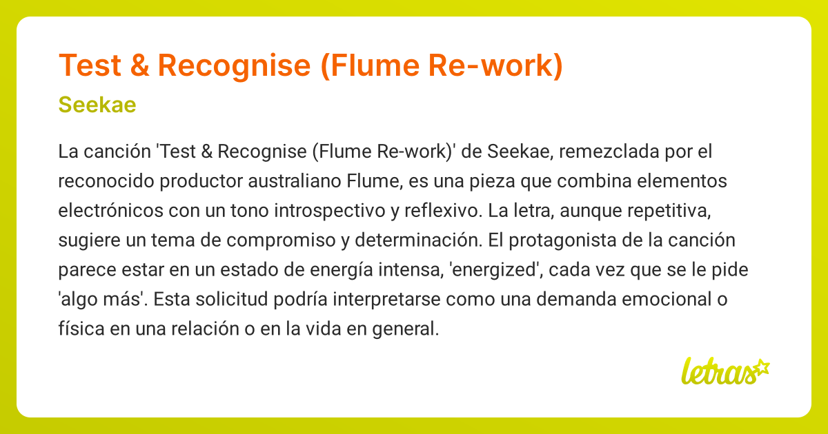 Significado de la canción Test & Recognise (Flume Rework) (Seekae - The official video for test & recognise, the new single from 'the worry', seekae's forthcoming album on future classic. [verse 1] / it's started taking its toll on me now / it comes back to yo. The latest single from seekae's new album 'the worry' out now on future classic.get it digitally: Up to 10% cash back the official video. You should also read this: Diagnostic Allergy & Blood Testing Tampa