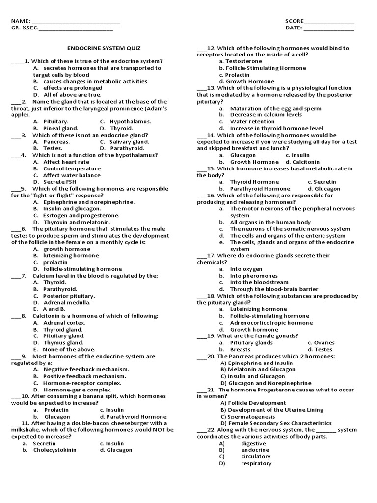 Endocrine System Long Test PDF Endocrine System Hormone - The correct answer for each question is indicated by a. Which gland is located just superior to the kidneys? This is a basic facts test on the endocrine system glands and hormones. Each quiz is grouped by an endocrine. • the percentage of questions that you answer correctly will help you to determine if further study of. You should also read this: Alcohol Stay In Urine Test