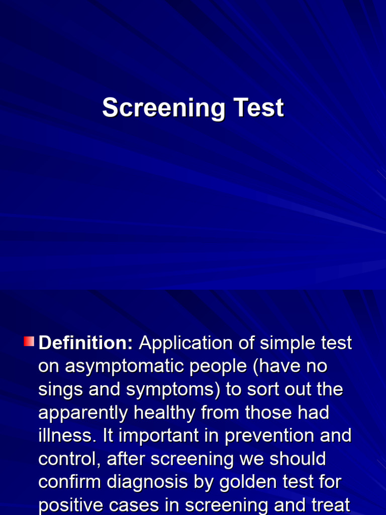 PPT Screening PowerPoint Presentation, free download ID6525736 - Screening tests need to demonstrate reliability and validity. In positive people, these tests would correctly identify disease in 70% of the cases (true positive). No screening test has perfect (100%) sensitivity and perfect (100%) specificity. The data collection was planned after the index and reference tests were performed. A previous study analyzed edinburgh postnatal depression scale (epds) data for 13. You should also read this: Clear Blue Rapid Pregnancy Test Positive Results Pictures