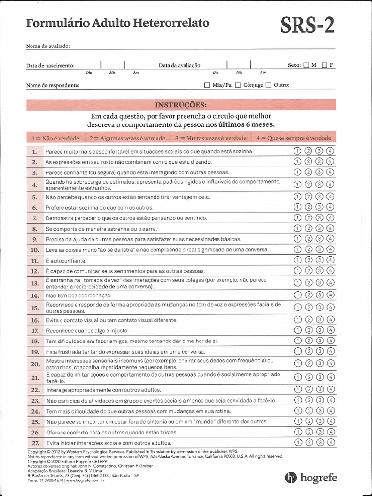 SRS2 Escala de Responsividade Social Coleção Completa Tamasa - Scoring and graphing can be completed in approximately 5 to 10 minutes. There will be one for you to complete and one for. It is used primarily with individuals on the. Products currently available online include: The autism quotient (aq) is a questionnaire that measures an individual’s traits associated with autism. You should also read this: Civil Service Suffolk County Test Results