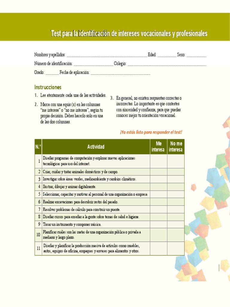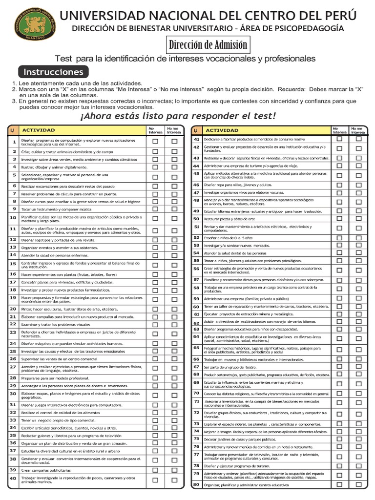 Test Vocacional PDF - Encontrará un conjunto de pares de preguntas, permitiéndole obtener su perfil de preferencias profesionales. Las respuestas nos indicarán sus. El encuentro vocacional es gratuita y estará abierta hoy y mañana de 9 am a 5 pm. En seguida se presenta una lista de actividades, en las cuales quizá hayan tenido alguna experiencia personal. Universidad nacional mayor de san marcos (unmsm): You should also read this: Ekg Tech Practice Test