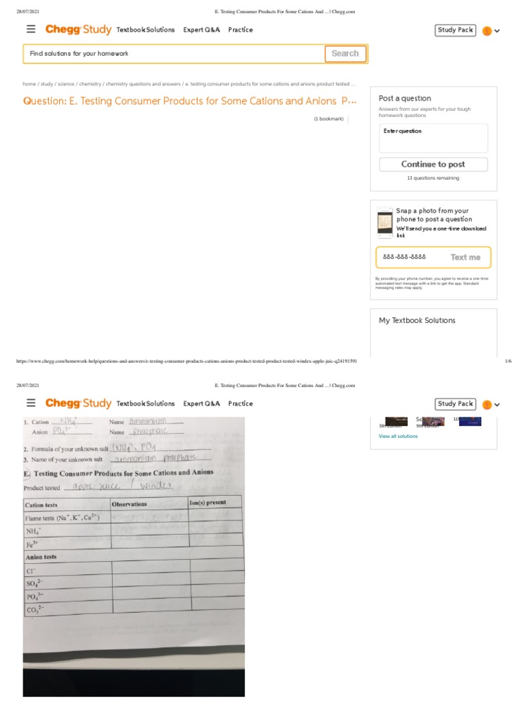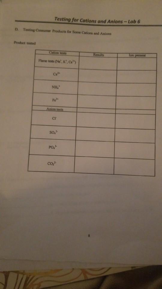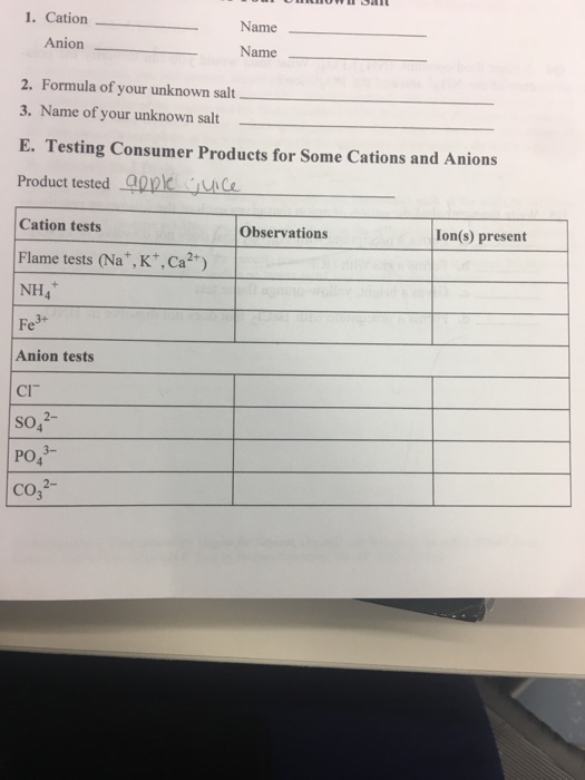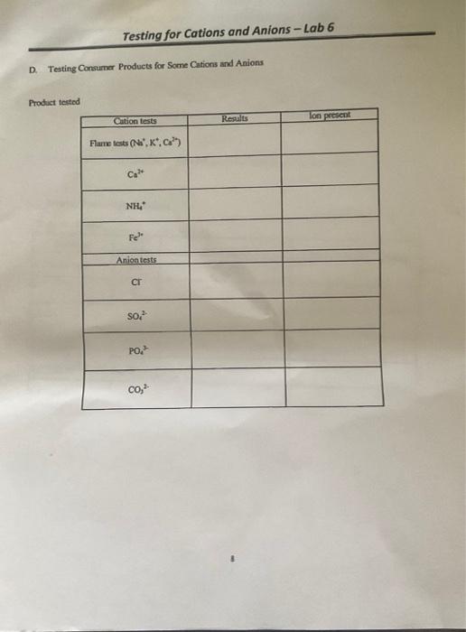 Solved E. Testing Consumer Products for Sinw Cations and - In this episode of keipert labs, we introduce the processes we can use in the lab to identify common cations and anions. The test illustrates some of the techniques and limits of qualitative analysis. When performing the analysis to determine which was the limiting reactant, a student found that the addition of bacl2â·2h2o to a test tube resulted in a.. You should also read this: Fallout 3 Test Answers