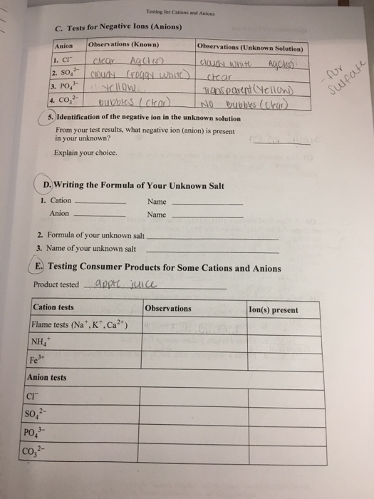 Solved Testing for Cations and Anions Lab 6 D. Testing - Note that some cations do not form salts. We'll look at common tests and develop a flowchart to follow for both. There is a variety of techniques that can be used and, in the case of some organic chemistry, it can get very complicated: Cation and anions are atomic particles, so they require specialty testing procedures and equipment to identify.. You should also read this: Dat Blood Test Procedure