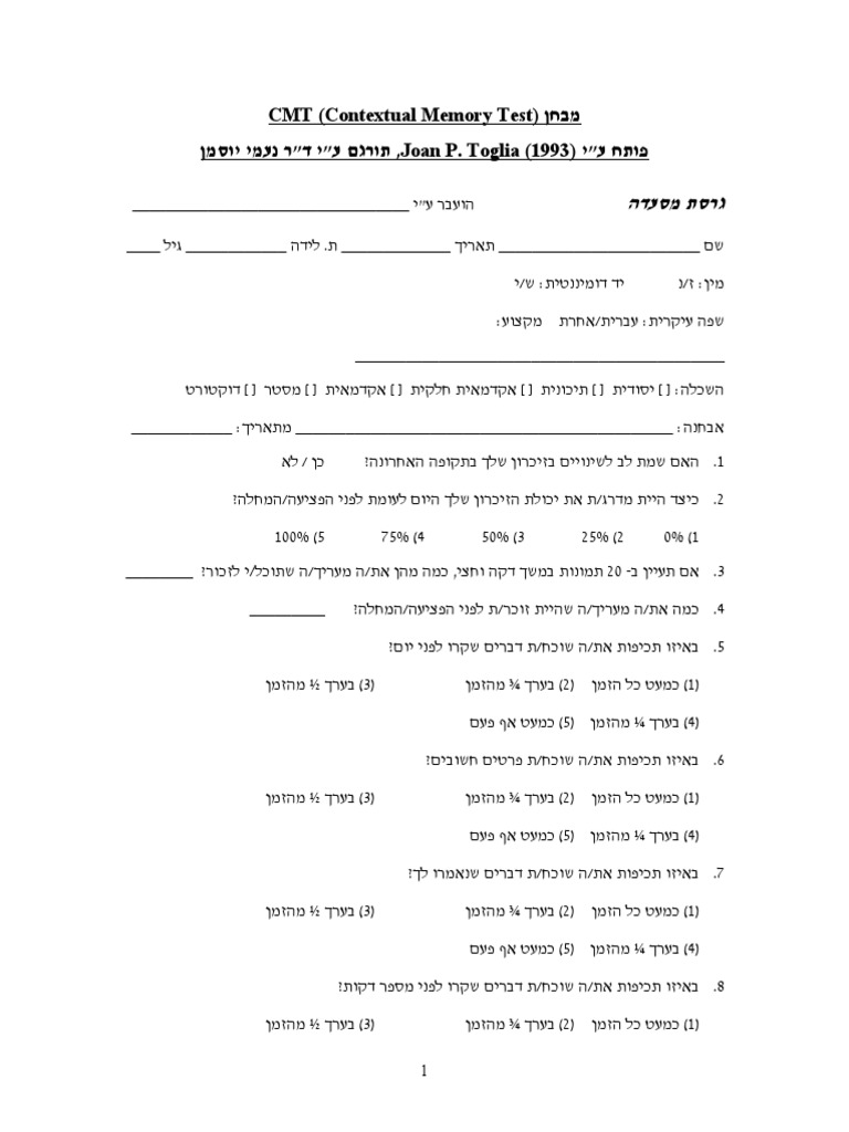 Contextual Memory Test (CMT) — Multicontext - Are, to be sure, a miracle. Contextual memory test by joan p. The cmt was administered to 217 typical israeli adults, grouped into three age categories, closely matching those in the us normative study (toglia, 1993). The memory is sometimes so retentive, so serviceable, so obedient; Toglia, june 1993, communication skill builders edition, paperback in english You should also read this: Colonoscopy Blood Test