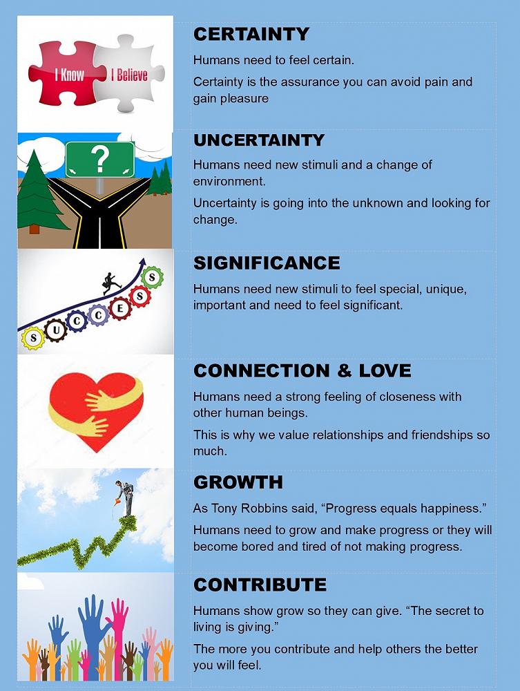 Anthony Robbins’ Six Human Needs & Healing/Rebuilding Broken - What are the 6 human needs? Your desires, decisions, and dreams are driven by six fundamental human needs. What are the 6 human needs? Not everyone meets the last two, but everyone finds a way to. The 6 human needs is a philosophy by tony robbins. You should also read this: Gt Weld Testing