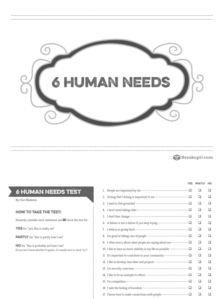 The 6 human needs were developed by Tony Robbins as a framework to - It defines how human beings are essentially wired and how we all find a way to meet these which can be. Your desires, decisions, and dreams are driven by six fundamental human needs. Human needs is the desire for certainty that we can avoid pain and gain pleasure (i.e. Take this quick quiz to discover your top human need, the. You should also read this: Test For Seniors Crossword Clue