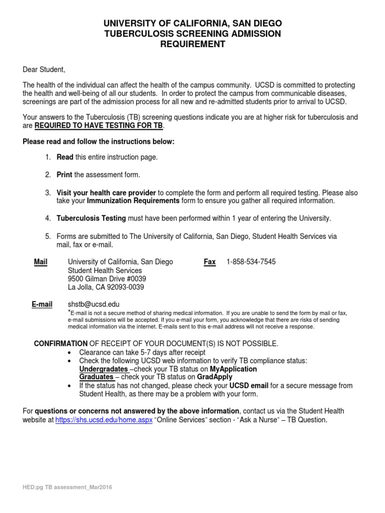 Protecting Campus Health UCSD's Tuberculosis Screening Admission - Two step tuberculin skin test (tst) performed within the last 3 months, with first ppd. Your answers to the tuberculosis (tb) risk assessment questionnaire indicate you are at. Thank you for reaching out. The tb skin test tells you if the tb bacteria are in your body. I'm an incoming transfer student, and i only learned about the tb test. You should also read this: Landmark Chipotle Iq Test Answers
