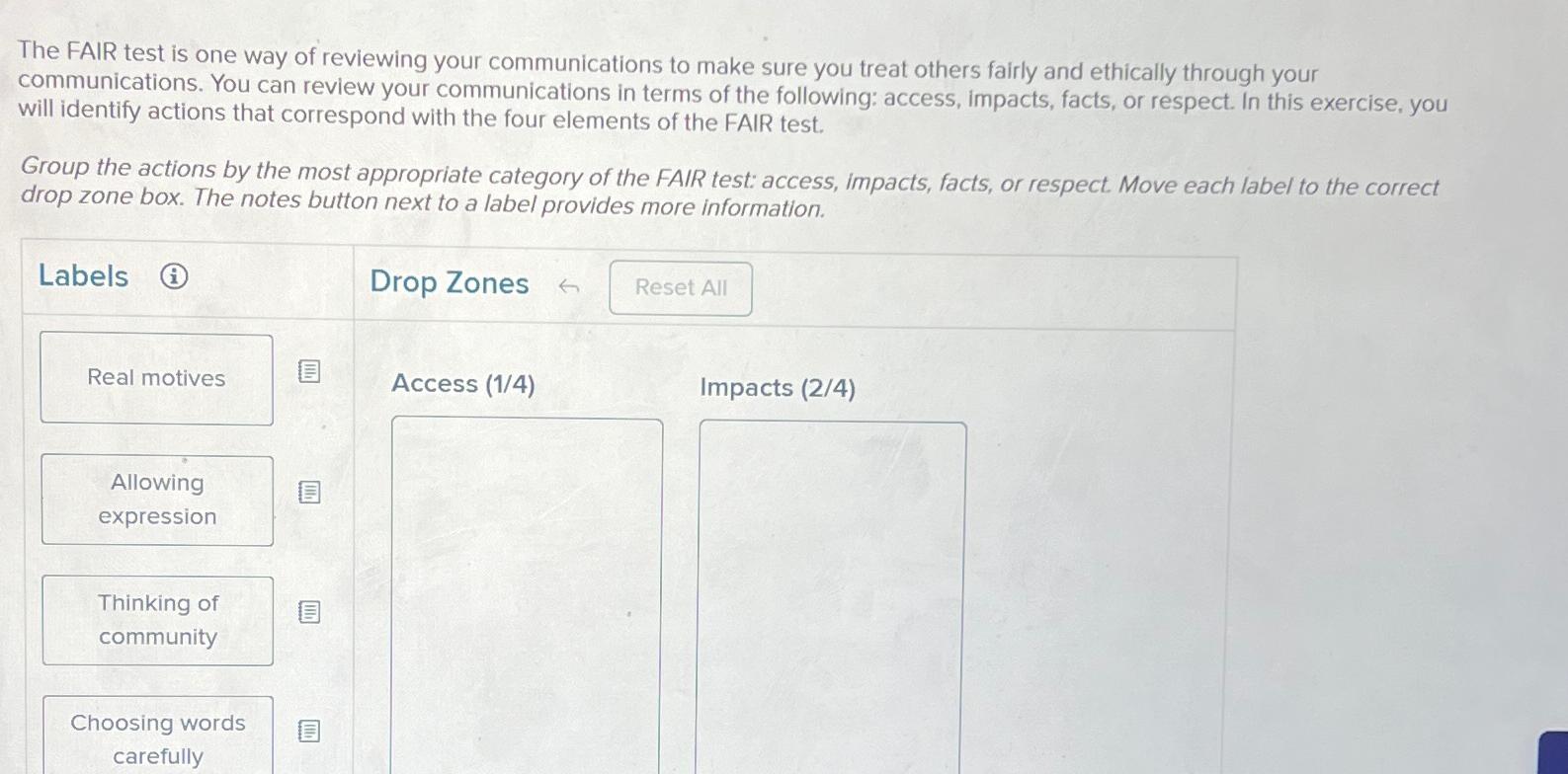 Solved What does the "A" in the FAIR test of ethical - How well you have shown respect; To foster trust in verbal and written communications, apply the fair test, as elaborated in greater detail in the pamphlet provided. It stands for facts, access, impacts, and respect. Fair test business communication is the process of exchanging information, ideas, and messages in a clear, concise, and respectful manner. Study with quizlet and memorize. You should also read this: Tb Test Reading Near Me