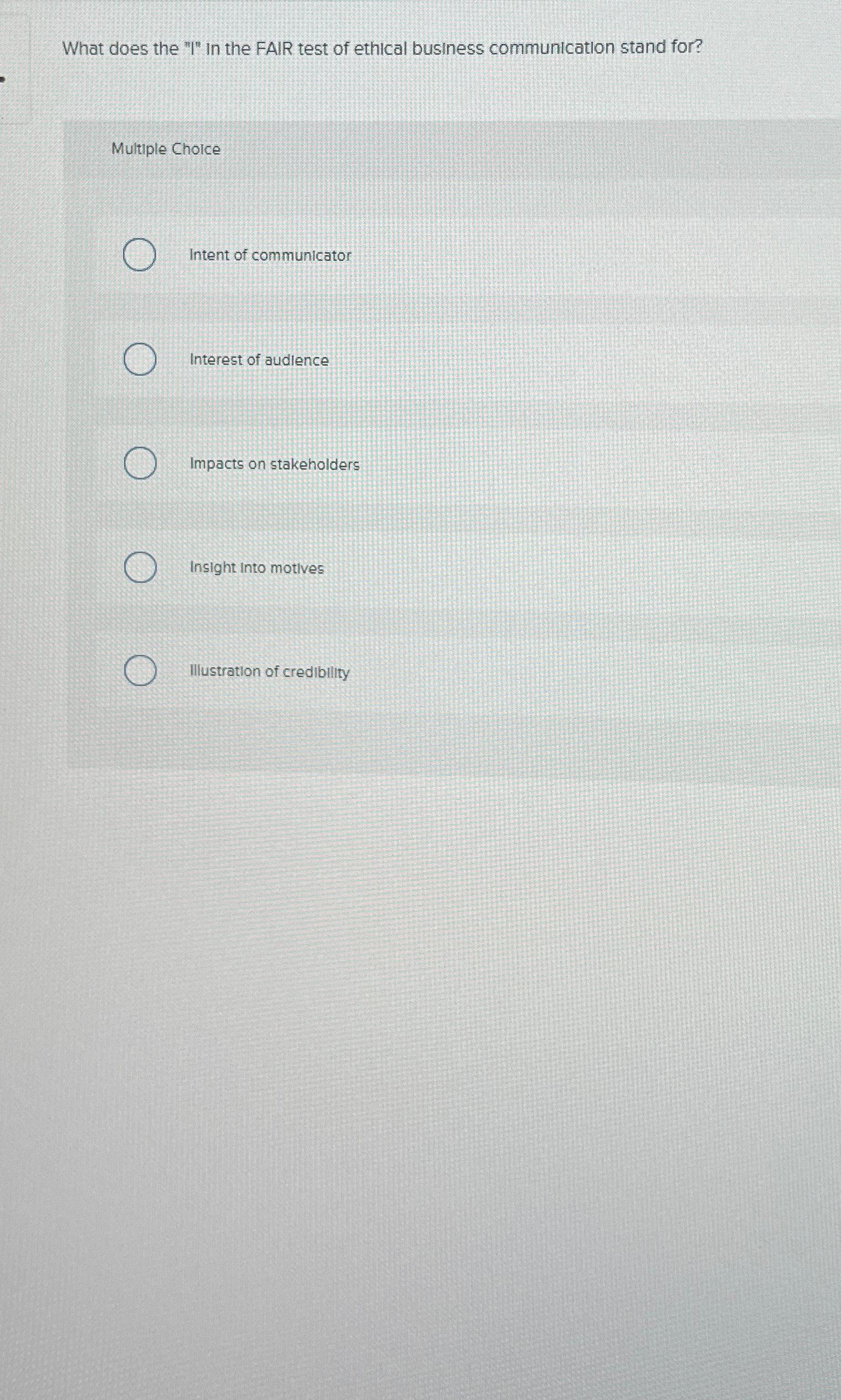 Solved What does the "I" In the FAIR test of ethical - Fair test business communication is the process of exchanging information, ideas, and messages in a clear, concise, and respectful manner. How does your communication impact stake. Study with quizlet and memorize flashcards containing terms like what are components of the fair test?, who would likely be the best person to read your persuasive messages and give. How accessible or transparent. You should also read this: Any Lab Test Now Naples Fl