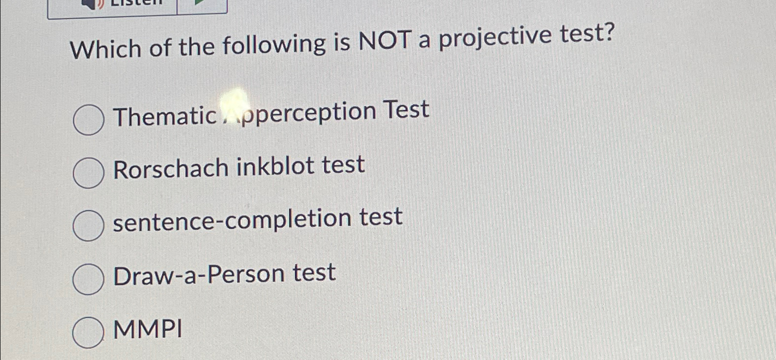 Solved Which of the following is NOT a projective - O bjective interpretation means not influenced by or based on a. Which of the following assessments is not considered a projective test? Minnesota multiphasic personality inventory (mmpi). Minnesota multiphasic personality inventory (mmpi) a personality assessment in which a person responds to ambiguous stimuli, revealing unconscious feelings,. Study with quizlet and memorize flashcards containing terms like which of the following is. You should also read this: Blood Test Rdw Low