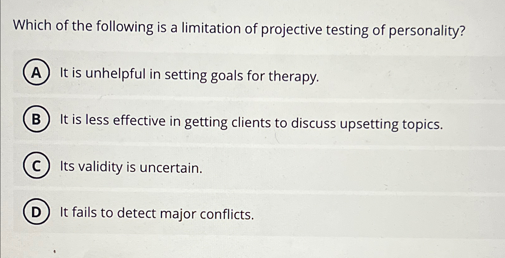 Solved Which of the following is a limitation of projective - Which of the following is not a projective test? Not the question youβre looking for? The minnesota multiphasic personality inventory (mmpi) is not a projective test. Which of the following assessments is not considered a projective test? Psychological tests can be broadly categorized into two types: You should also read this: Nj Motorcycle Knowledge Test Practice