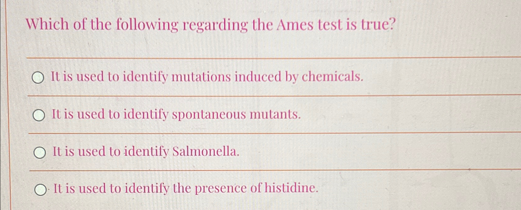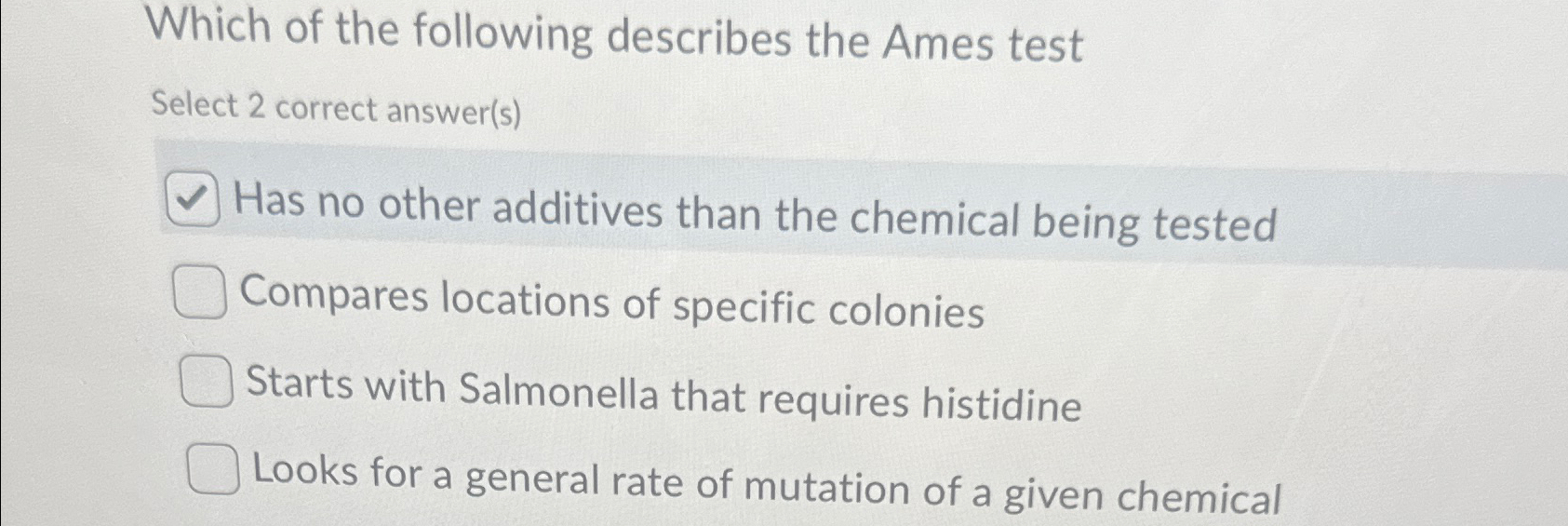 Solved Which of the following describes the Ames testSelect - Which of the following regarding the ames test is true? It is used to identify newly formed auxotrophic mutants. It is used to identify mutants with restored biosynthetic activity. The ames test is used to. it is used to identify mutations induced by chemicals. You should also read this: What Is Sleep Test Love Is Blind