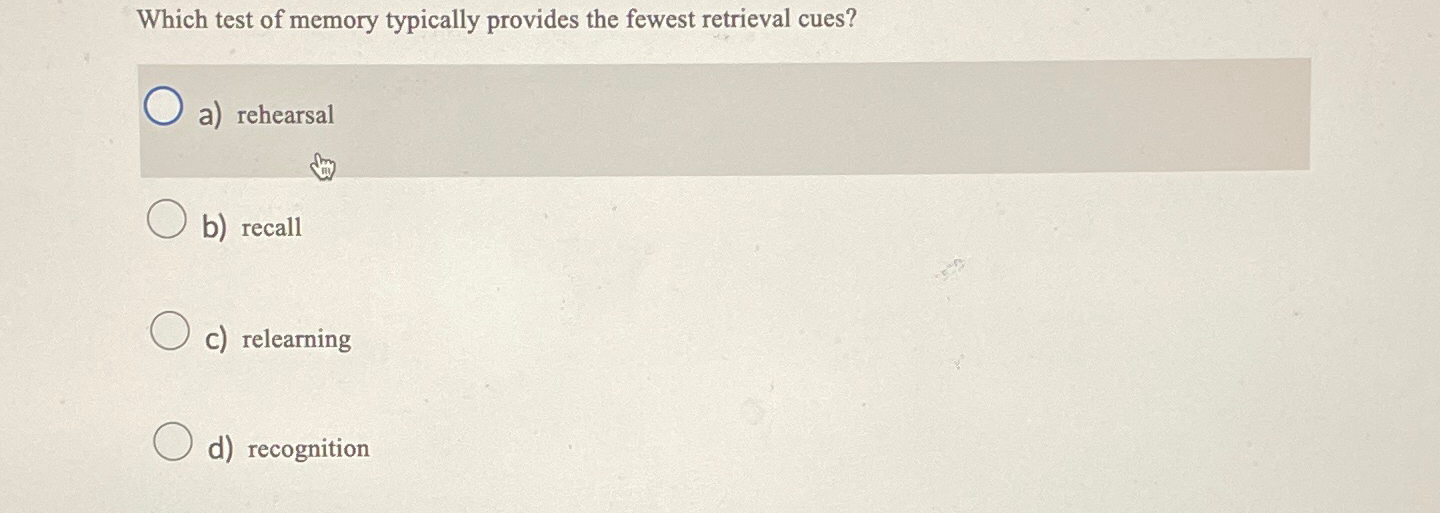 Solved Which test of memory typically provides the fewest - Study with quizlet and memorize flashcards containing terms like which test of memory typically provides the fewest retrieval cues?, which measure of memory retention assesses the amount. Which test of memory typically provides the fewest retrieval cues? Which test of memory typically provides the fewest retrieval cues? Which test of memory typically provides the fewest retrieval cues? Which measure of. You should also read this: Bladder Tests For Men